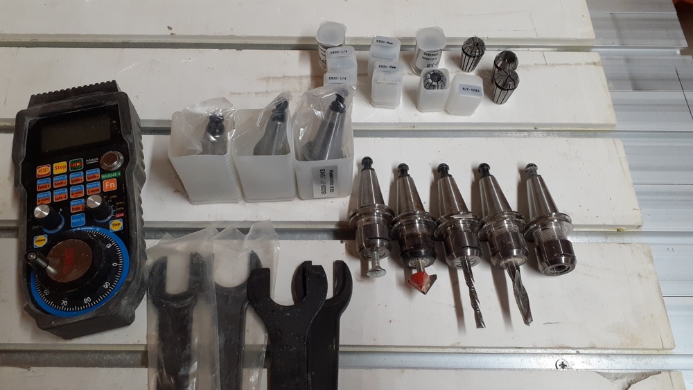 Inclus un ordinateur, un écran plat, clavier et souris. Windows 10 pro, logiciel de contrôle CNC Mach 3, logiciel de dessin Aspire 9.5, banque de dessins vectoriels et images en reliefs 3D. Inclus 8 cônes et plusieurs collets de différentes dimensions, pratiquement tous neufs.