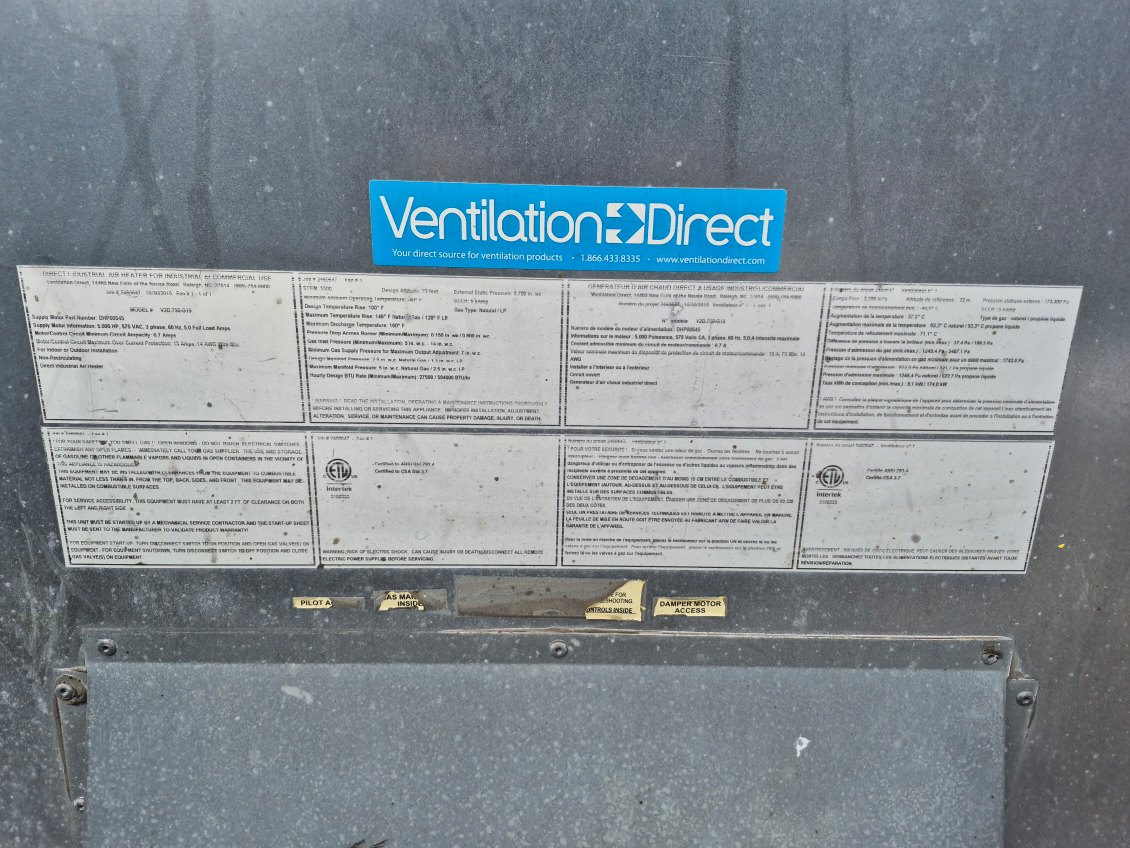 Make-up Air (unité de chauffage) gaz Naturel Ventilation Direct