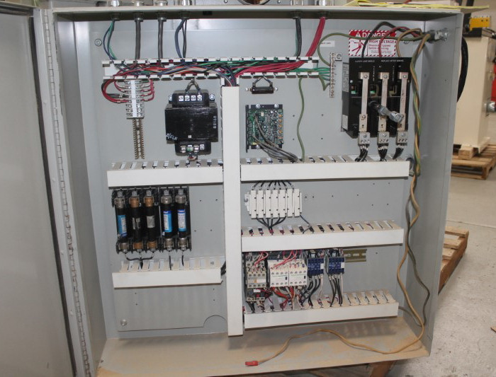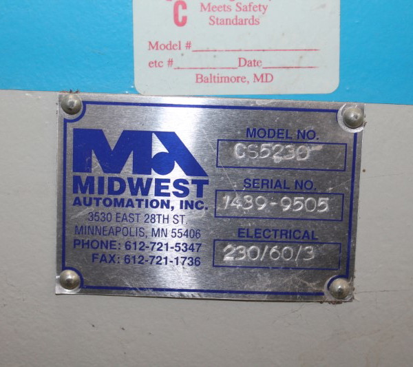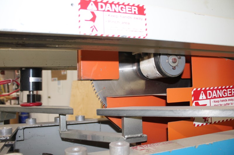 MIDWEST AUTOMATION Model 5230 COUNTERTOP SAW (W/ROUTERS) with Laser for cutting off or mitering postformed and/or coved tops. 5 HP – 3,400 RPM Main motor, 0.5 HP carriage drive motor, variable feed speed from 0 – 45 FPM with 45 FPM fixed return speed.